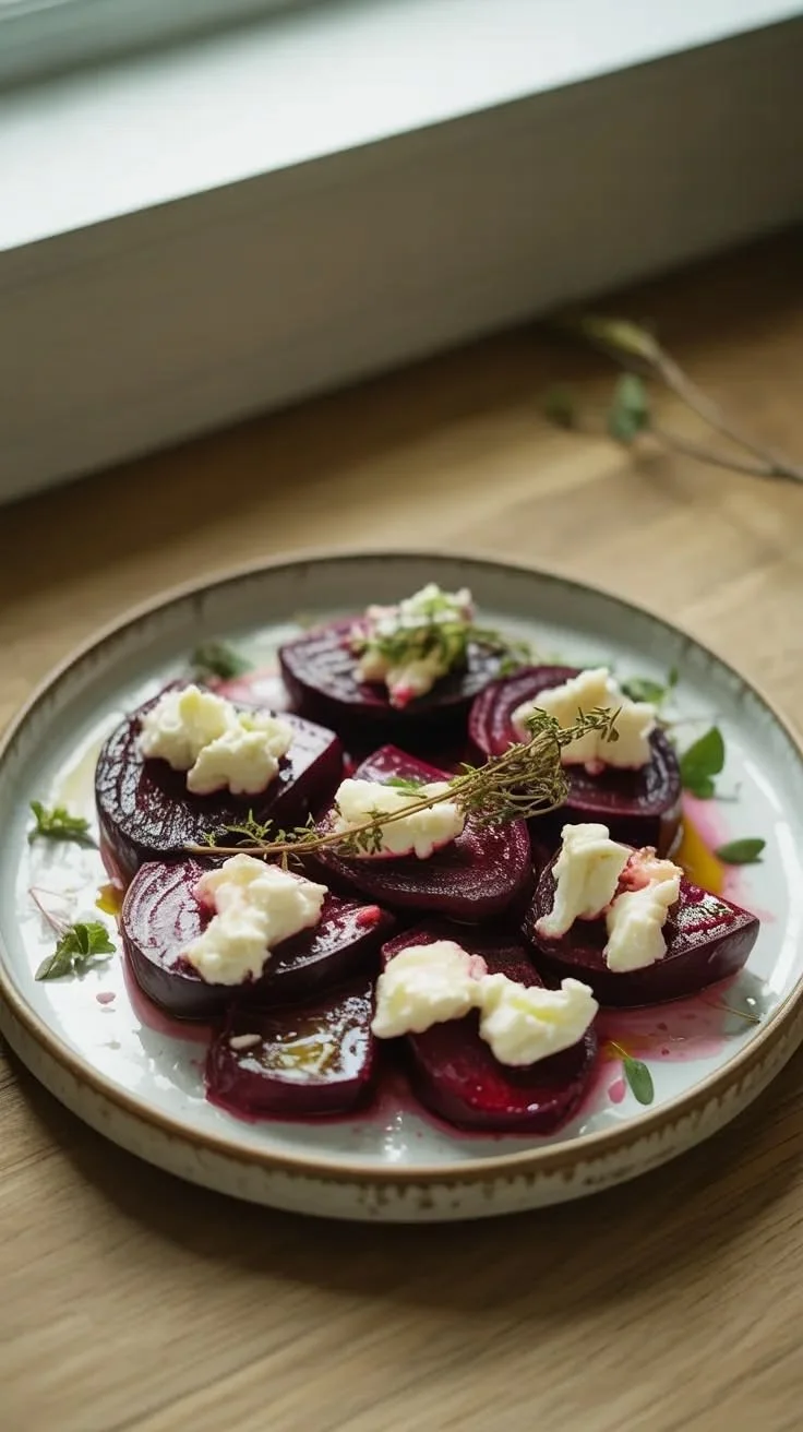 Starter: salt baked beetroot, whipped goats cheese, smoked aubergine emulsion, honey roasted pecan, orange