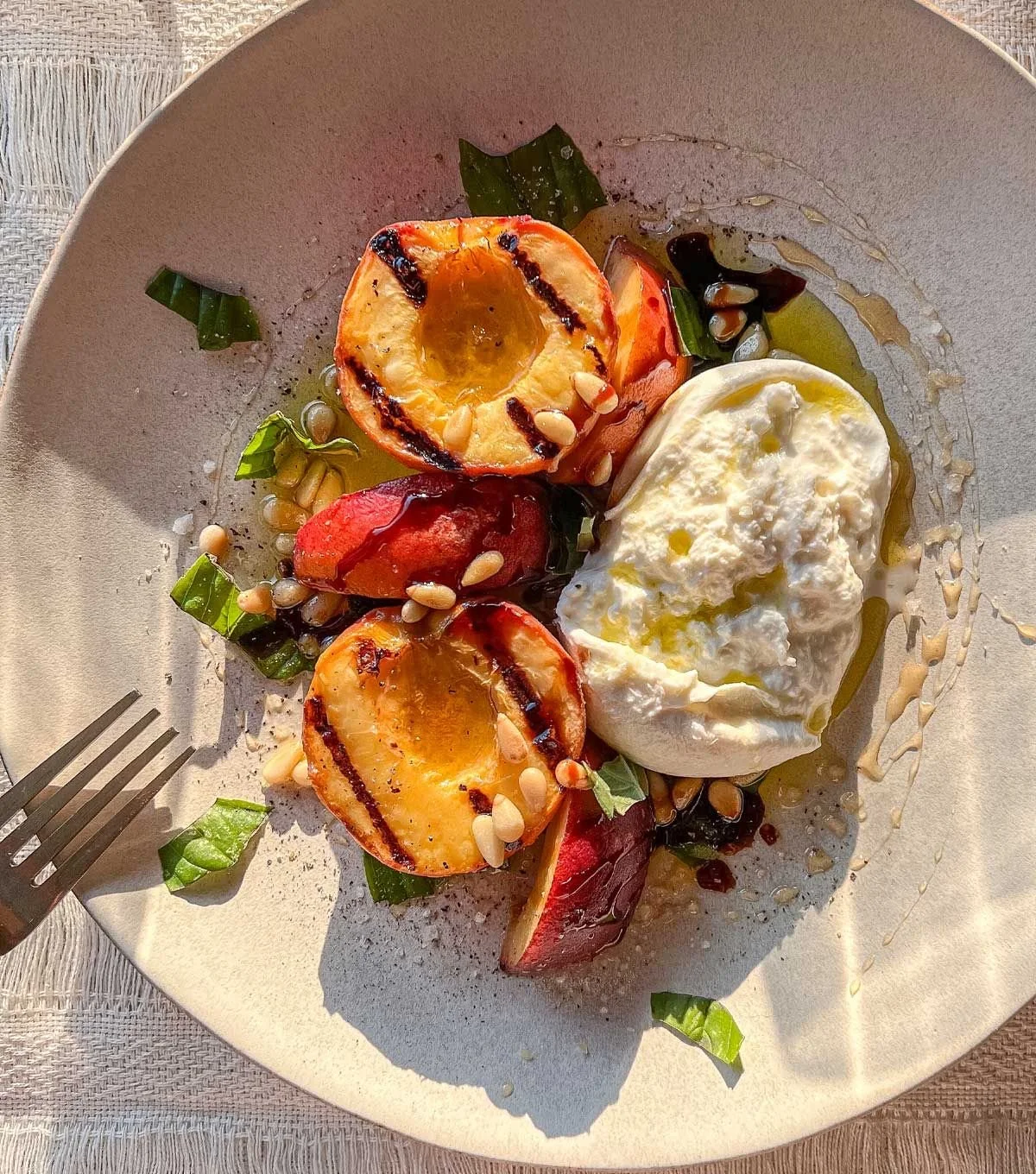 Starter: grilled peach, burrata, wild garlic pesto, wild honey, rocket and oregano