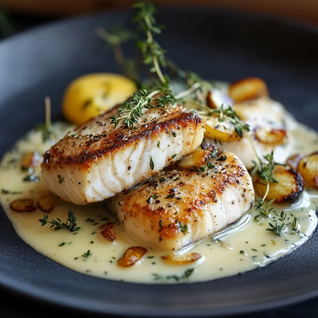 Main: grilled sea bass, wild rocket pesto crushed new potatoes, tender stem, caper, cream and white wine sauce.